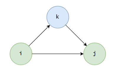 즉 아래와 같은 세 노드가 있을 때, 기존에 주어진 i → j 의 길이와 노드 k가 중간에 추가된 i → k → j 를 비교하여 i → j 의 길이를 더 작은 값으로 갱신하는 것이다.