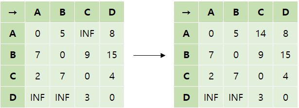 - $DP[A][C] = min(DP[A][C], DP[A][B] + DP[B][C]) → DP[A][C] = min(INF, 14)$