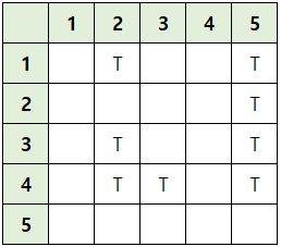 여기서 i번 행은 i가 이길수 있는 대상을, i번 열은 i를 이길수 있는 대상을 의미한다. 즉, i번 행과 i번 열의 T값의 합이 4가 되어야 한다(n-1이 되어야 함). 코드를 보면 아래와 같다.
