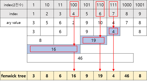 즉, ary[1]~ary[7] = f.tree[1112]+f.tree[1102]+f.tree[1002] 이 된다.